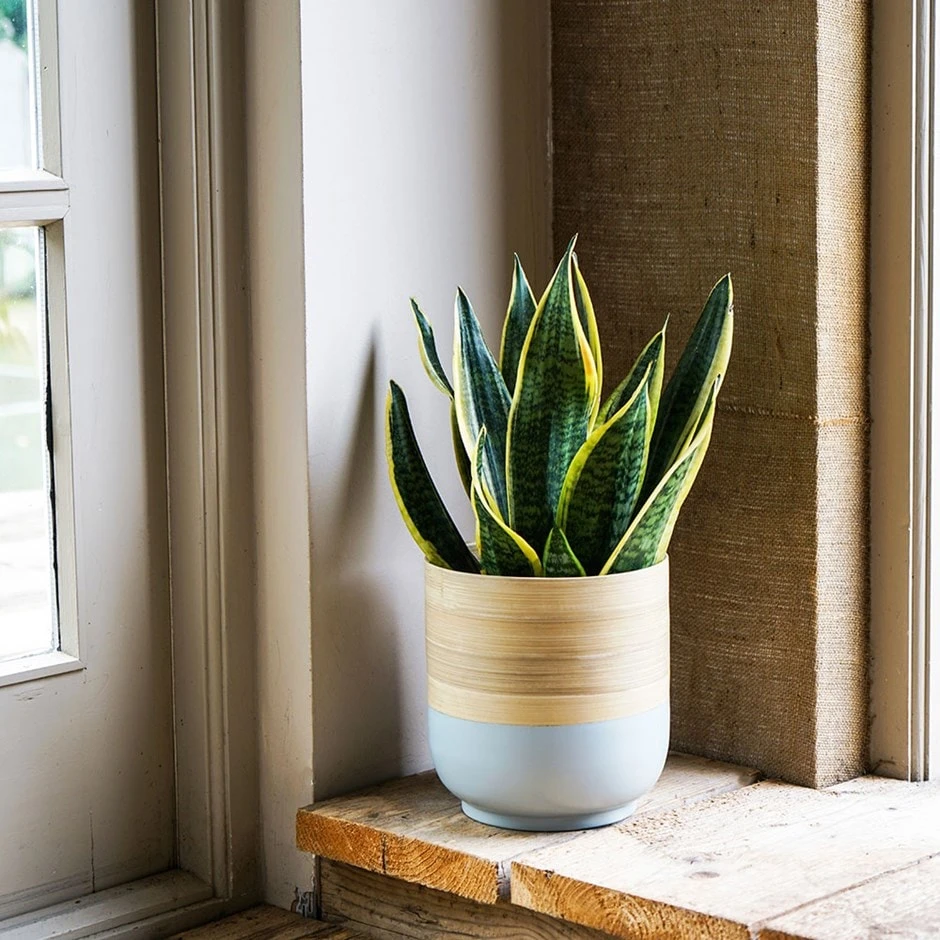 Handmade light and sturdy bamboo pot with a natural and light blue finish. Supplied without drainage holes for use as an indoor pot cover. Available in a choice of sizes.