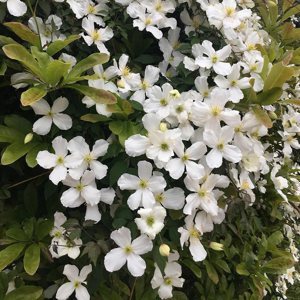 Exquisite, pure white, late spring and early summer flowers with yellow centres and dark green leaves. This extremely vigorous clematis is excellent for training over a pergola or covering an unsightly wall, fence or garden shed. It’s an ideal climber for a north-facing site.