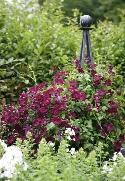 Masses of dramatic, dark velvety-purple flowers from July to September and mid-green leaves. This vigorous viticella-type clematis looks stunning grown through plants with pale, silvery-grey or variegated foliage. Ideal for training through a strong tree or shrub in full sun or partial shade it is resistant to clematis wilt and stands up well to wind.
