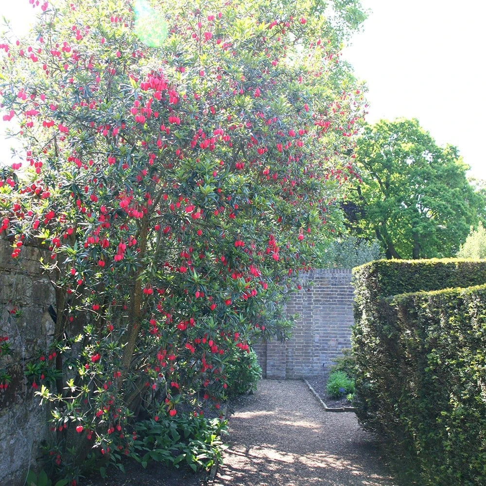A beautiful, ornamental, evergreen shrub or small tree named after the lantern-shaped, crimson to deep carmine-pink flowers, suspended from the undersides of its branches from May to August. This award-winning lantern tree is perfect for a partially shady woodland garden with humus-rich acid soil. Initially slow-growing, in cold areas it’s best grown in a cool greenhouse or conservatory to minimise the risk of frost damage to the young flower buds.