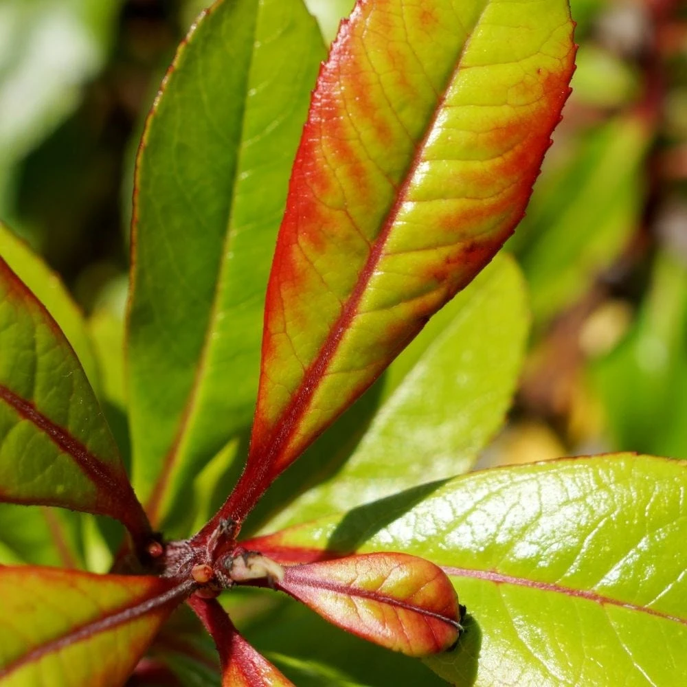 Each spring, the new foliage of this evergreen shrub emerges with an orange-red blush, but as it matures, it first turns yellow, and then mid-green. The leaves are held on red-tinted stems, so the overall effect is very showy – particularly when the pink flowers appear in summer.