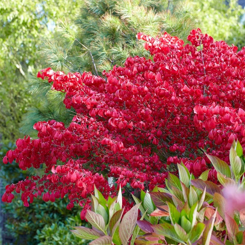 A dense, bushy, deciduous shrub with dark green leaves turning brilliant shades of strawberry red in autumn. This winged spindle is named after the large, corky wings that are revealed after it has shed its leaves. Best planted in an area where the sun catches the spectacular autumn foliage, it makes an excellent specimen plant for a well-drained shrub border or woodland edge.