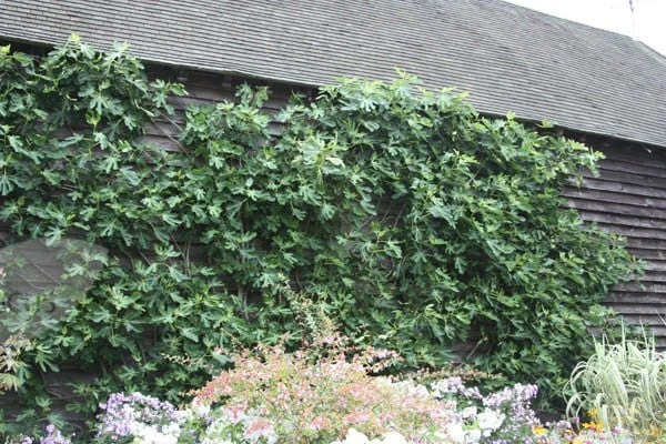 This deciduous, spreading shrub is highly ornamental, with large, glossy, palmate leaves. It is best grown against a south or south-west facing wall, where, in long, hot summers it will produce an abundant crop of brown, pear-shaped fruit with red flesh. These figs are rich and sweet and available for picking from August to September. An interesting and easy plant to grow, and one of the oldest fruits in cultivation.