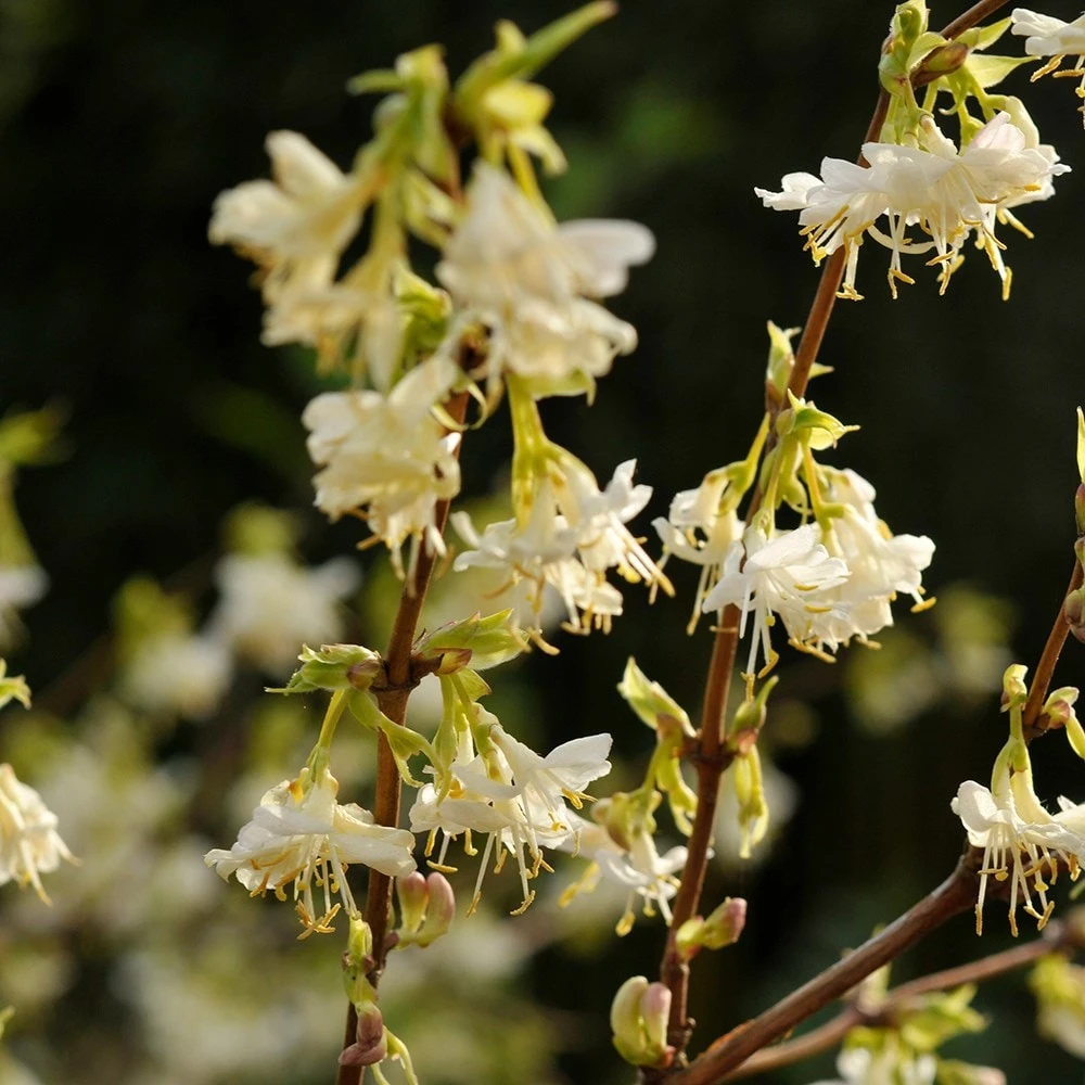 This wonderful, winter-flowering shrub produces fragrant, creamy-white flowers in mild spells between December and March on almost leafless branches. These are sometimes followed by dull red berries. The leaves, when they appear, are a rich shade of green – usually flushed with a plush purple. This is a splendid, deciduous or semi-evergreen shrub, that will flower more profusely when trained against a sunny wall. Try to plant it close to an entrance or pathway so you can catch its lingering aroma each time you pass.