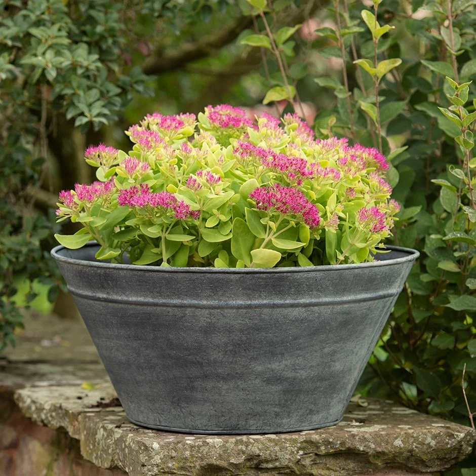 A classic conical metal planter with a wide mouth to provide a generous planting area. Made from steel with a distressed aged zinc finish and pre-drilled with drainage holes for direct planting.