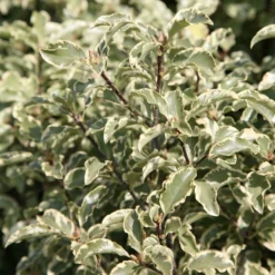 Prized for its striking, dark grey or black young stems clothed with distinctive, wavy, small grey-green leaves edged with cream, this large, bushy, evergreen shrub or small tree forms a natural oval. It makes a lovely backdrop to a sunny, well-drained border and responds well to light clipping into a more formal shape. An excellent plant for warm coastal areas, where it can successfully be grown as an attractive, variegated windbreak or hedge.