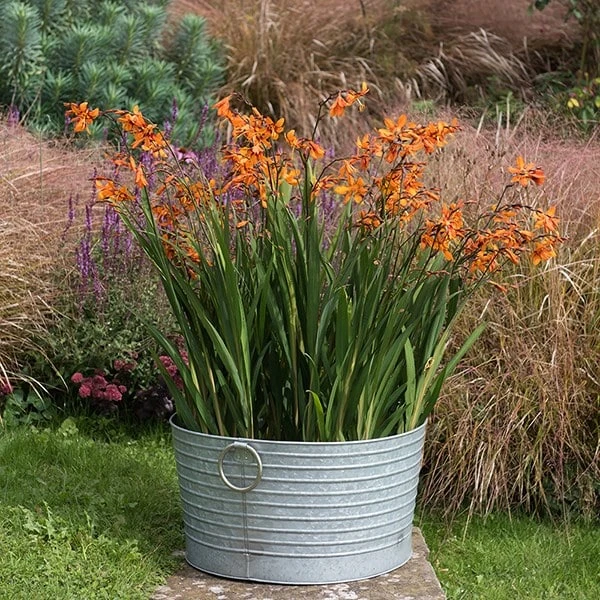 These low industrial ribbed metal containers look great planted up with a mass of one plant or a combination of several to create clusters of colour. Lighter and more manoeuvrable than traditional terracotta pots, the muted grey finish provides the perfect backdrop to showcase vibrant displays.