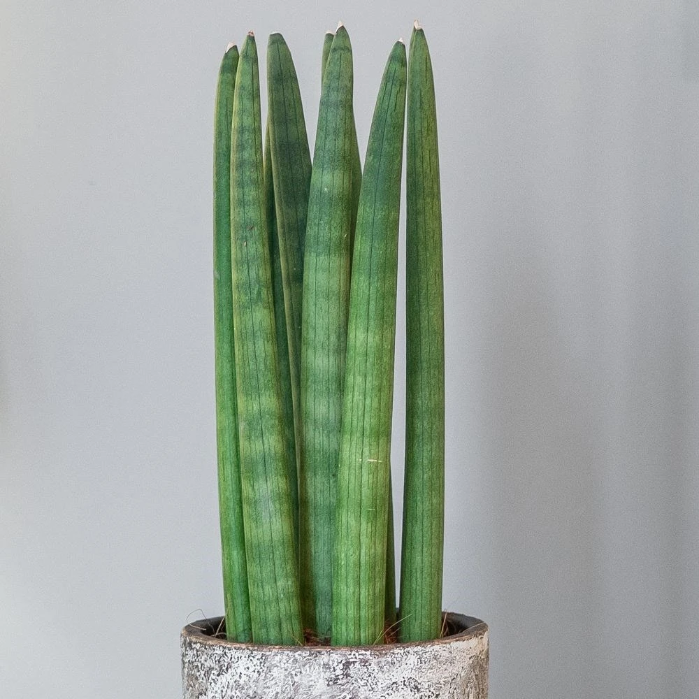 Sansevieria cylindrica is an elegant, low maintenance houseplant with smooth, leathery, spear-like foliage. As its name suggests, ‘Straight’ is distinctly upright in habit and the minimalist, striking grey-green variegation adds to its appeal as a tough, air purifying plant for any stylish, contemporary home or office. Please be aware however that it is quite common for the plants to have small nicks or scars on their leaves. This is an indication of the plants maturity and does not have any affect on their long-term health or vigour in any way.